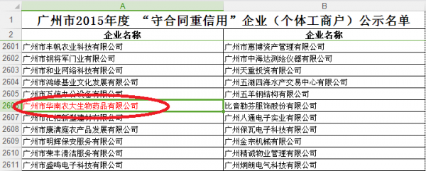 根據(jù)廣東省工商行政管理局《關于印發(fā)廣東省守合同重信用企業(yè)公示活動規(guī)則的通知》(粵工商市字〔2009〕697號)和廣州市工商行政管理局《關于守合同重信用公示活動有關問題的通知》(穗工商合〔2013〕209號)精神,經(jīng)廣州各行業(yè)協(xié)(商)會推薦,并征求各有關部門的意見,認為廣州市華南農大生物藥品有限公司符合廣州市2015年度 “守合同重信用”公示條件。