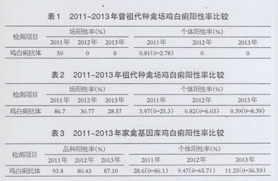 2011~2013年曾祖代、祖代種禽場和地方品系雞雞白痢陽性率進(jìn)行比較(見表1、2、3)可見,曾祖代種禽場除了2011年檢測陽性率較高外,2012~2013年檢測結(jié)果都比較好,陽性率為0;祖代種雞場持續(xù)保持雞白痢抗體陽性,但整體陽性率處于降低的水平,局部雞場可能出現(xiàn)了反彈;家禽基因庫雞白痢抗體陽性率保持在很高的水平。雞白痢抗體陽性率整體處于下降水平,但是在這些種雞群中存在ALV、REV等不同病原的兩重或多重感染。