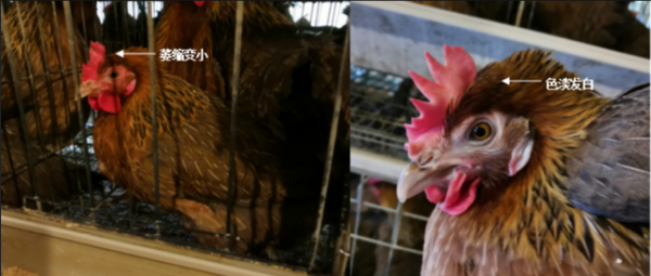 正常開產(chǎn)的成熟雞群雞冠、肉髯應(yīng)該豐滿挺立,紅潤溫暖,感染IBV后出現(xiàn)異常的雞群會觀察到有部分雞的雞冠、肉髯萎縮變小、色淡發(fā)白,用手觸摸感覺冰涼。