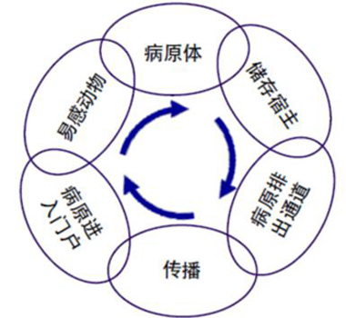 病原微生物必須有足夠數(shù)量與易感宿主家禽接觸,才能使該病原引起的疾病在易感家禽間擴(kuò)散。為了感染家禽,病原微生物必須與動(dòng)物有足夠的接觸(傳染壓力)。同時(shí),病原體必須能具有傳染性才能可通過(guò)直接接觸(雞與雞)和/或間接接觸(經(jīng)由污染的設(shè)備、環(huán)境等)和/或通過(guò)攜帶者進(jìn)行傳播。蟲類、鳥類、其他動(dòng)物或一些有機(jī)物可作為某些病原的儲(chǔ)存宿主(例如飼料和糞水),使病原持續(xù)存在。對(duì)傳染鏈(圖1)的一個(gè)或幾個(gè)環(huán)節(jié)有實(shí)質(zhì)性影響的行為都會(huì)降低疾病傳播的風(fēng)險(xiǎn)。