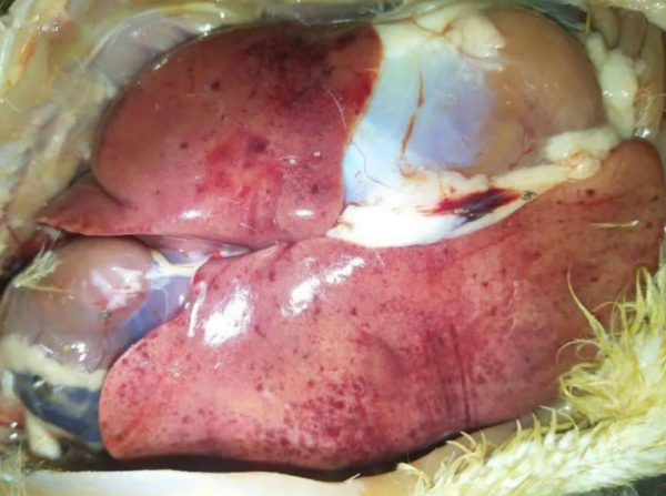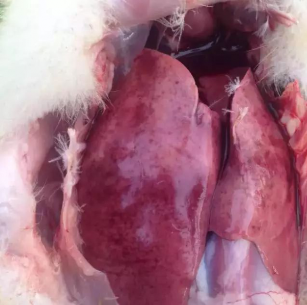 鴨肝炎病毒潛伏期一般為1~4d,突然發(fā)病,病程短促。病初表現(xiàn)為精神萎靡,眼半閉呈昏睡狀,羽毛松亂,翅下垂,行動呆滯,縮頸呆立,食欲不振甚至厭食、絕食;發(fā)病12~24h即出現(xiàn)神經(jīng)癥狀,病鴨全身性抽搐、運動失調(diào)、兩腳痙攣,身體倒向一側(cè)或就地旋轉(zhuǎn),頭向后仰呈角弓反張狀,故俗稱“背脖病”。少數(shù)病鴨死亡前排黃白色和綠色稀糞,數(shù)小時后死亡。也有的雛鴨無明顯臨床癥狀便突然死亡。 剖析可見肝臟特征性病變:肝臟腫大,質(zhì)地柔軟,呈淡紅色或花斑狀,表面有出血點和出血斑,膽囊擴張,充滿膽汁。脾臟有時腫大,也呈斑駁狀。腎臟充血、腫脹,呈暗紫色樹枝狀。